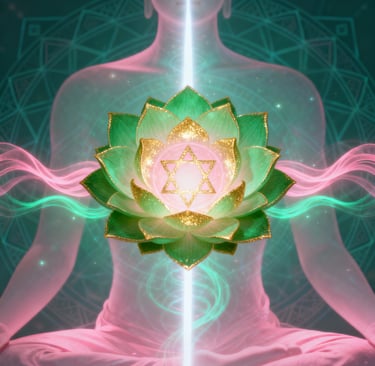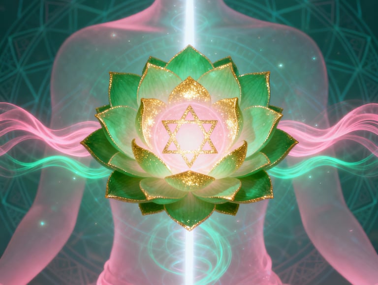 The Heart Chakra, located at the center of the chest, is symbolized by a twelve-petaled green lotus containing a shining hexagram, representing the balance of male and female energies, spirit and matter, giving and receiving.